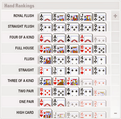 Susunan atau urutan dari kombinasi 5kartu poker dari yang tertinggi sampai yang paling rendah ialah :